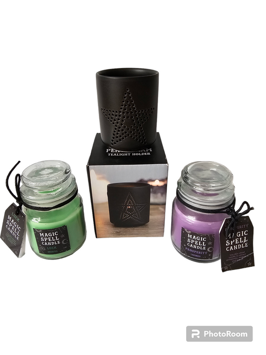 Pentagram Tealight Holder with 'Luck' & 'Prosperity' Spell Jar candles